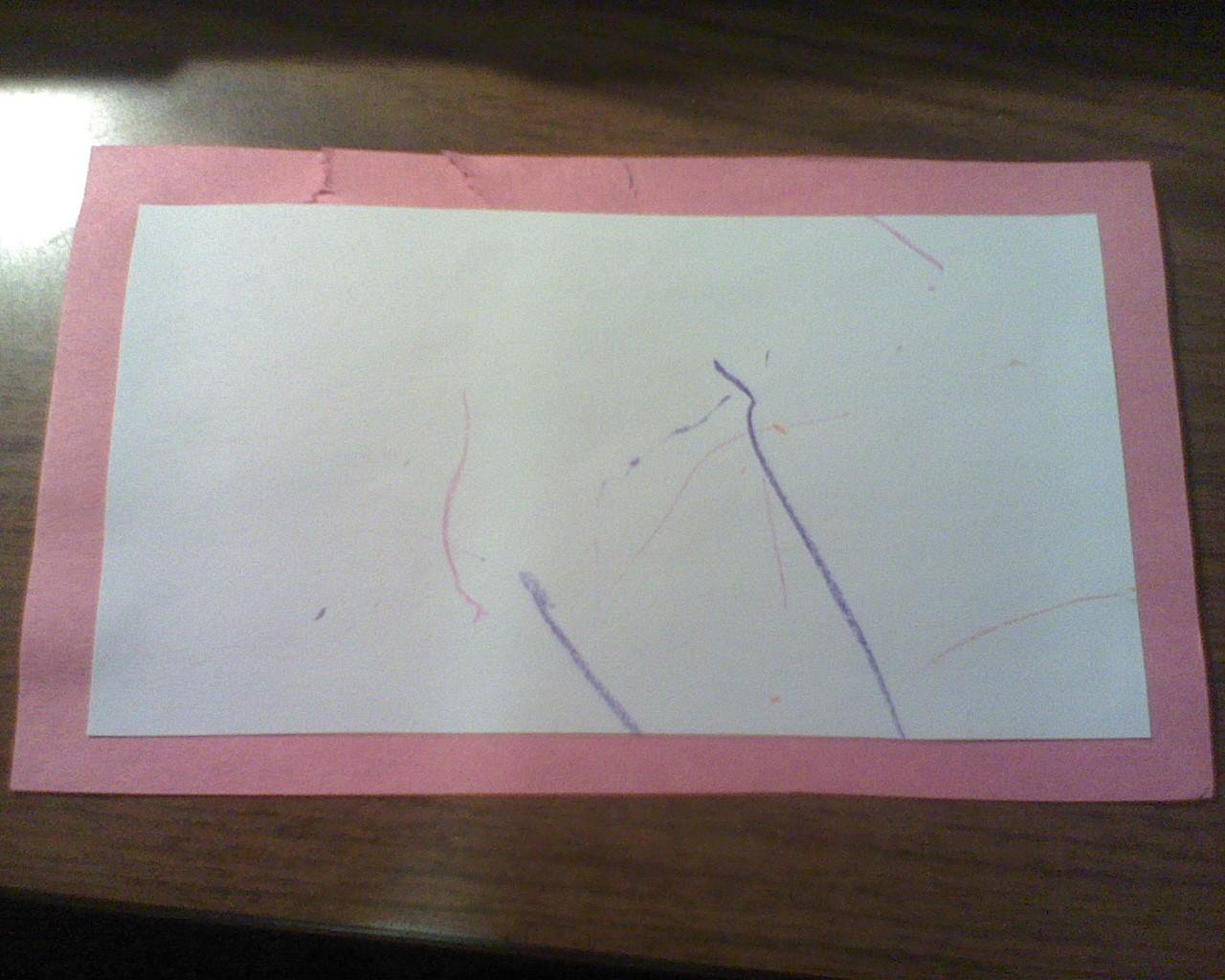 Saturday, February 19th, 2011For Valentine’s Day, Ian used crayons to create valentines for his family. This was his first time using crayons, and to be honest I’m shocked he was able to put marks down. Usually at about 18 months is when the “scribbling” stage of art develops (scribbles in a circular motion.) I figured he was a while away before being able to put all of the steps together to get a mark on the paper. Sure, most of them are by chance and strategic placing of the paper and he didn’t make very MANY marks (he’s a minimalist, I think.)